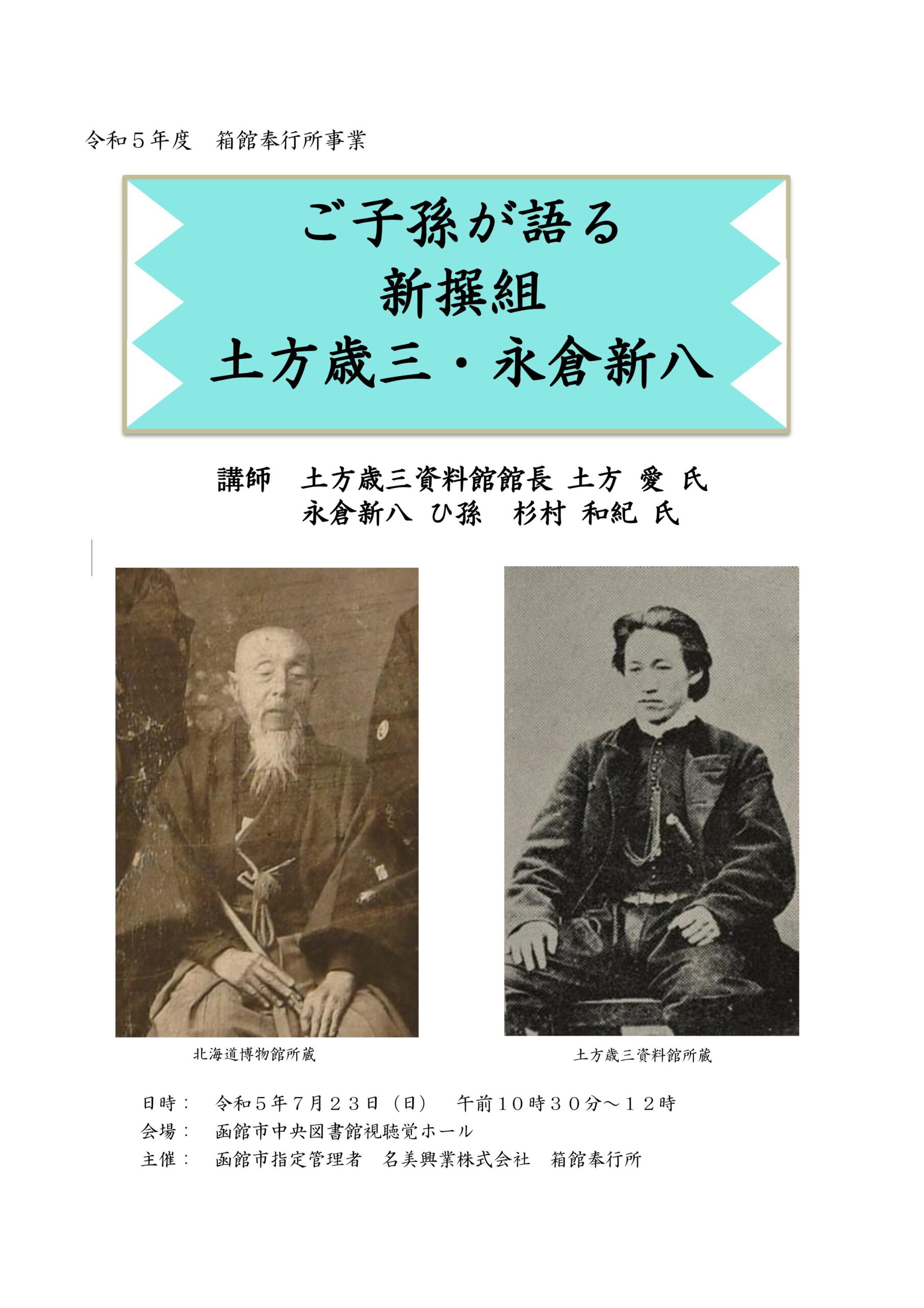 7月23日(日)、土方歳三兄の6代目ご子孫土方愛さんと、永倉新八改め杉村義衛(よしえ)ひ孫杉村和紀さんをお迎えし、「ご子孫が語る新撰組 土方歳三・永倉新八」を函館市中央図書館で開催いたしました。