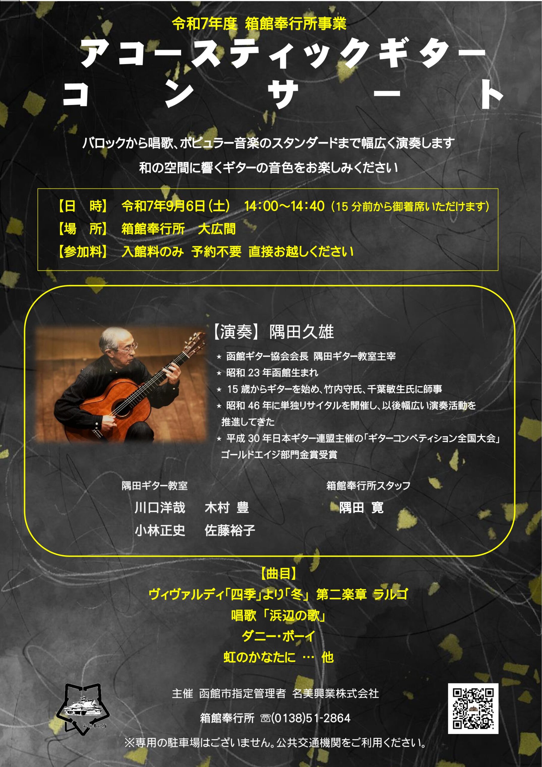 来る9月6日(土) 箱館奉行所におきまして 「アコースティックギターコンサート」を