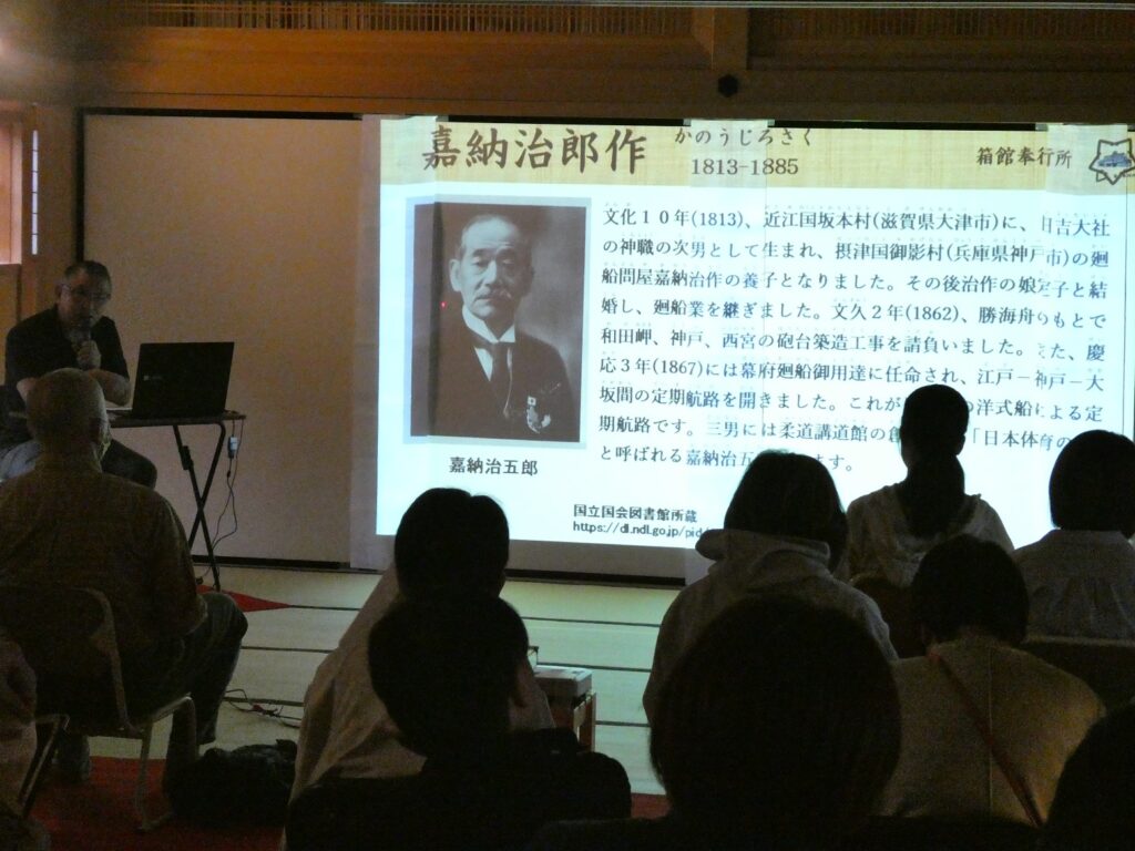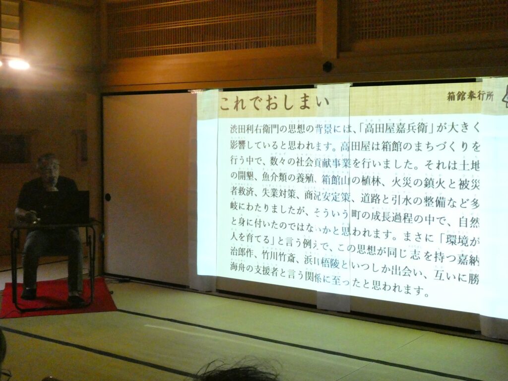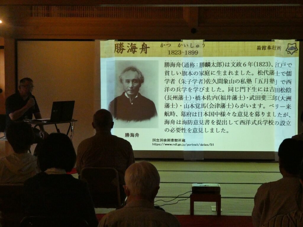日米修好通商条約批准書交換のため渡米し、また激動の幕末、江戸城を平和裡に明け渡し江戸を戦火から救った勝海舟。若き日の勝海舟を支援した箱館の商人渋田利右衛門。また自分亡き後を思い、支援者として勝海舟に紹介した嘉納次郎作、竹川竹斎、浜口梧陵についてもお話いたしました。今回はたくさんの皆様にお越しいただき、ありがとうございました。