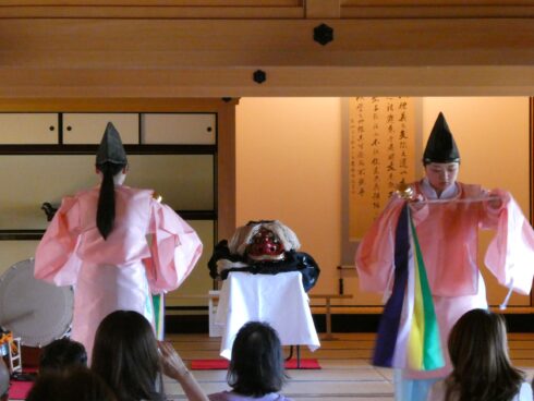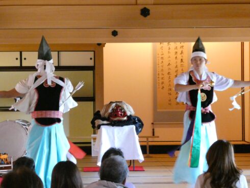 松前神楽連合保存会(尻岸内八幡神社)の皆さまによる「利生舞(りしょうまい)」「神遊舞(かんあそびまい)」「翁舞(おきなまい)」「獅子舞(ししまい)」の4つの舞をご披露いただきました。