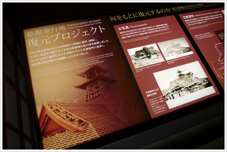 奉行所の内部には、時を超えて甦った役人別の詰所や仕事部屋などの再現ゾーンがあります。復元の仕事にたずさわった匠の技の数々をご堪能ください。歴史発見ゾーン、映像シアター、建築復元ゾーンなどでは、箱館奉行所があった時代を体感し、当時の歴史や失われた館内の様子が再現されるにいたった経過など、視覚的に工夫された資料等からご納得いただけるものと思います。