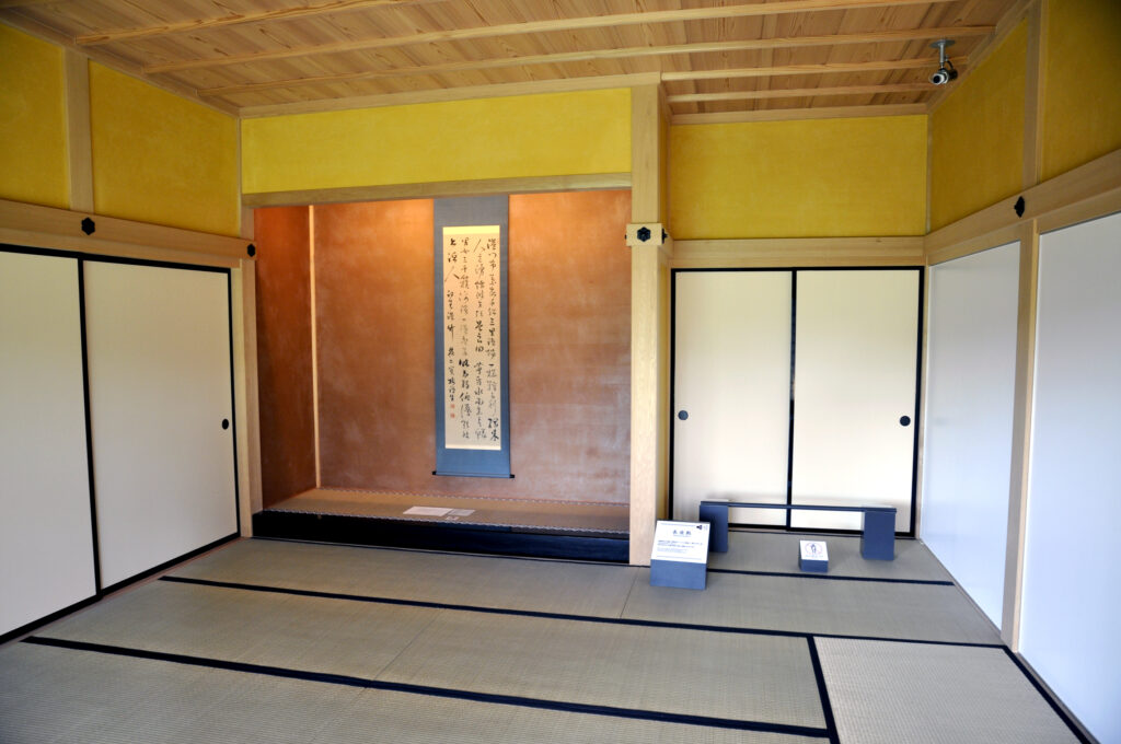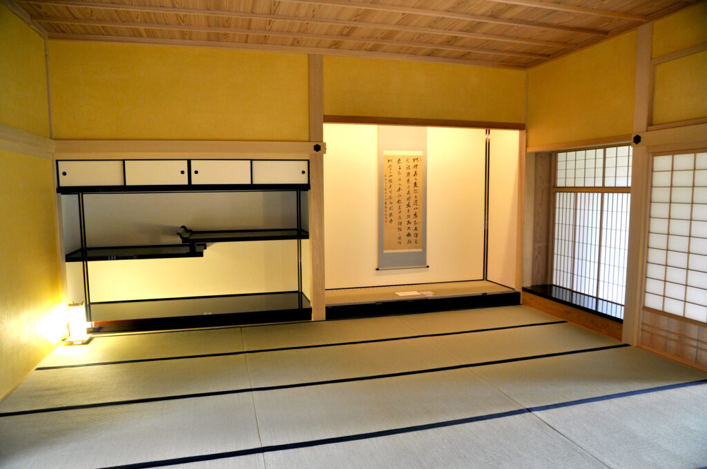 手前から四之間、参之間、弐之間、壹之間と4つの部屋がそれぞれ4枚の無地のふすまで仕切られています。畳数はそれぞれ15、21、18、18で合計72畳。最も奥の壹之間が、箱館奉行が接見に使用した部屋です。この部屋で、1868年幕府から明治政府への引き継ぎが、最後の箱館奉行・杉浦兵庫頭誠(すぎうらひょうごのかみまこと)と明治政府の総督・清水谷公考(しみずだにきんなる)との間で執り行われました。この部屋は四面とも節のない木柱で造作(ぞうさく)され、正面左にはみごとな欅の一枚板に華麗な漆黒の漆塗りの違い棚があり、その右の床の間には2人目の箱館奉行・堀織部正利煕(ほりおりべのしょうとしひろ)の書が掛けられています。畳には最高級の備後表が使用されています。また大広間の両側には畳廊下が続きます。各部屋との境は美濃(岐阜)産の手漉き和紙を張った障子、天井板は竿縁(さおぶち)とよばれる3本の細い木材が支えています。