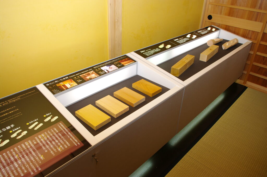 ここでは復元工事の設計から施工までの経過をパネルで紹介するほか、実際に使用された部材の実物(瓦、釘隠し、竹釘、木材)も展示されています。部材は実際に手にとって感触を確かめられるものもあります。金輪継ぎなど、日本古来の伝統的な木材の継ぎの手法なども興味深いものです。なお、このゾーンにはパソコン上で「幕末・歴史」と「史跡・建築」の2コースのクイズに挑戦するコーナーもあります。