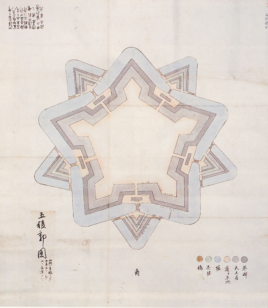 五稜郭は、設計当初から星形の土塁を計画していたわけではありません。武田斐三郎は、これまで蘭学で培った知識と、安政2(1855)年に箱館へ入港したフランス軍艦の軍人から得られた情報などから、大砲や小銃による戦闘が中心となったヨーロッパで考案された稜堡式築城術を基に五稜郭築造を設計しました。