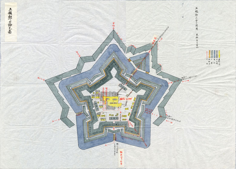 武田は模写した図面に独自の工夫を加えて設計図を完成させ、安政4(1857)年の春から五稜郭の工事が始まりました。途中、予算不足による縮小(半月堡を5か所から1か所に減らす)など、当初の設計や工事計画の変更がありましたが、万延元(1860)年には土塁・掘割・石垣の工事が完成しました。