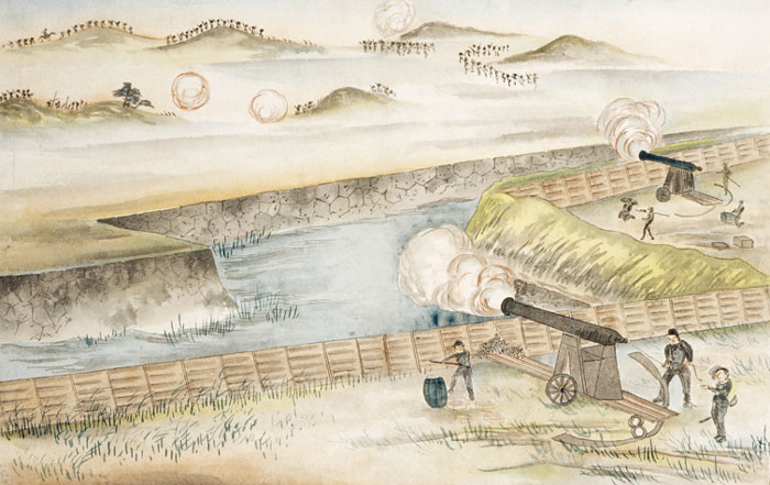 5月11日、新政府軍は箱館総攻撃をおこないます。四稜郭が陥落し、箱館市街は新政府軍が制圧しました。元新撰組副長・土方歳三が戦死、箱館港では旧幕府脱走軍の艦隊が全滅しました。五稜郭からは、土塁の上に配置したカノン砲を七重浜方面に向けて援護射撃しましたが、射程距離は短く港まで砲弾は届きませんでした。